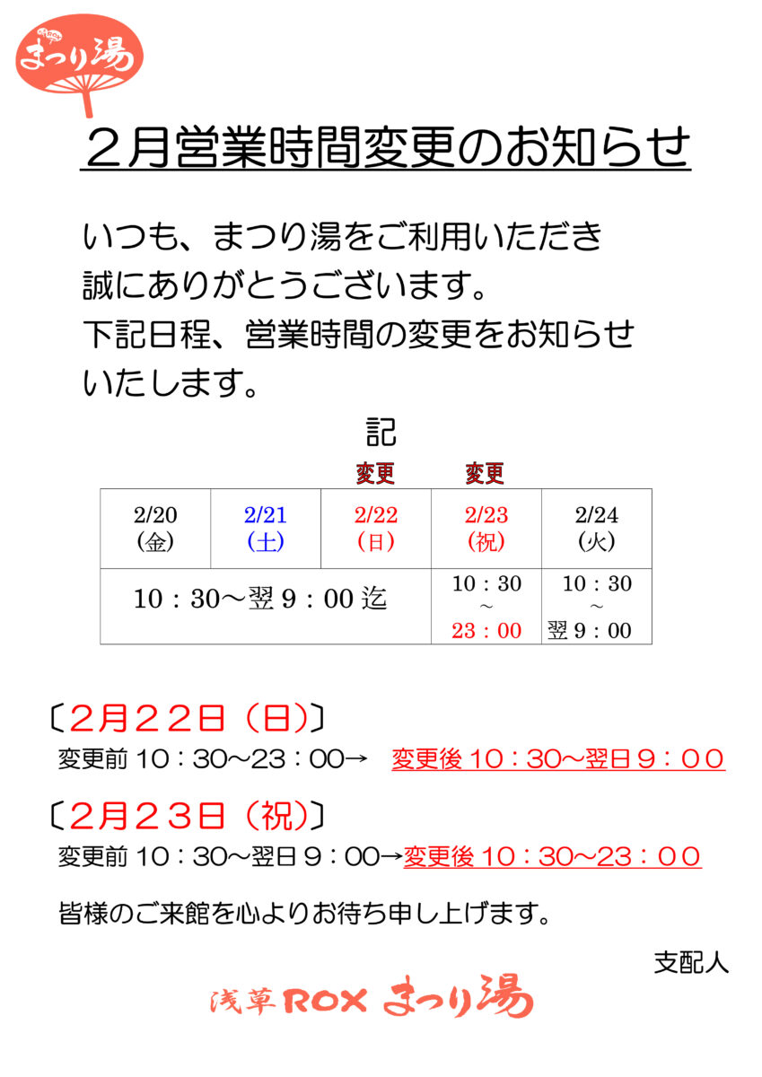 2月営業時間変更のお知らせ